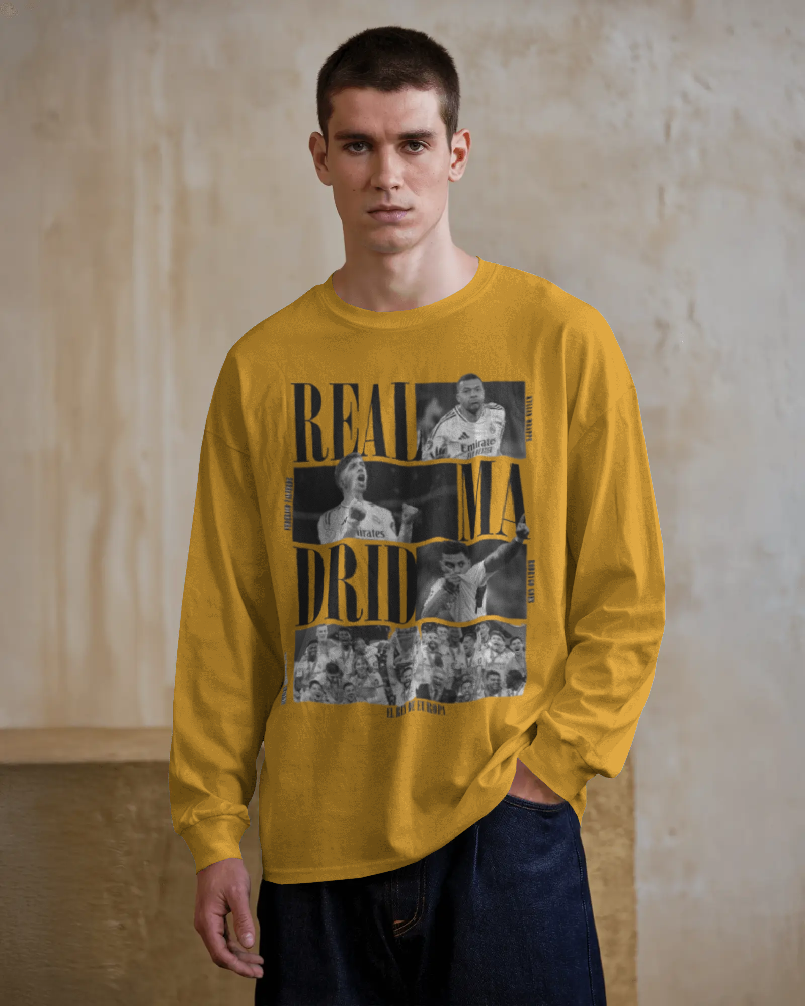 The graphic features a collage of legendary Real Madrid players and team celebrations in a classic black-and-white print, overlaid with bold, distressed typography spelling out "REAL MADRID." The rich, mustard/gold fabric symbolizes the club's regal status and championship legacy.